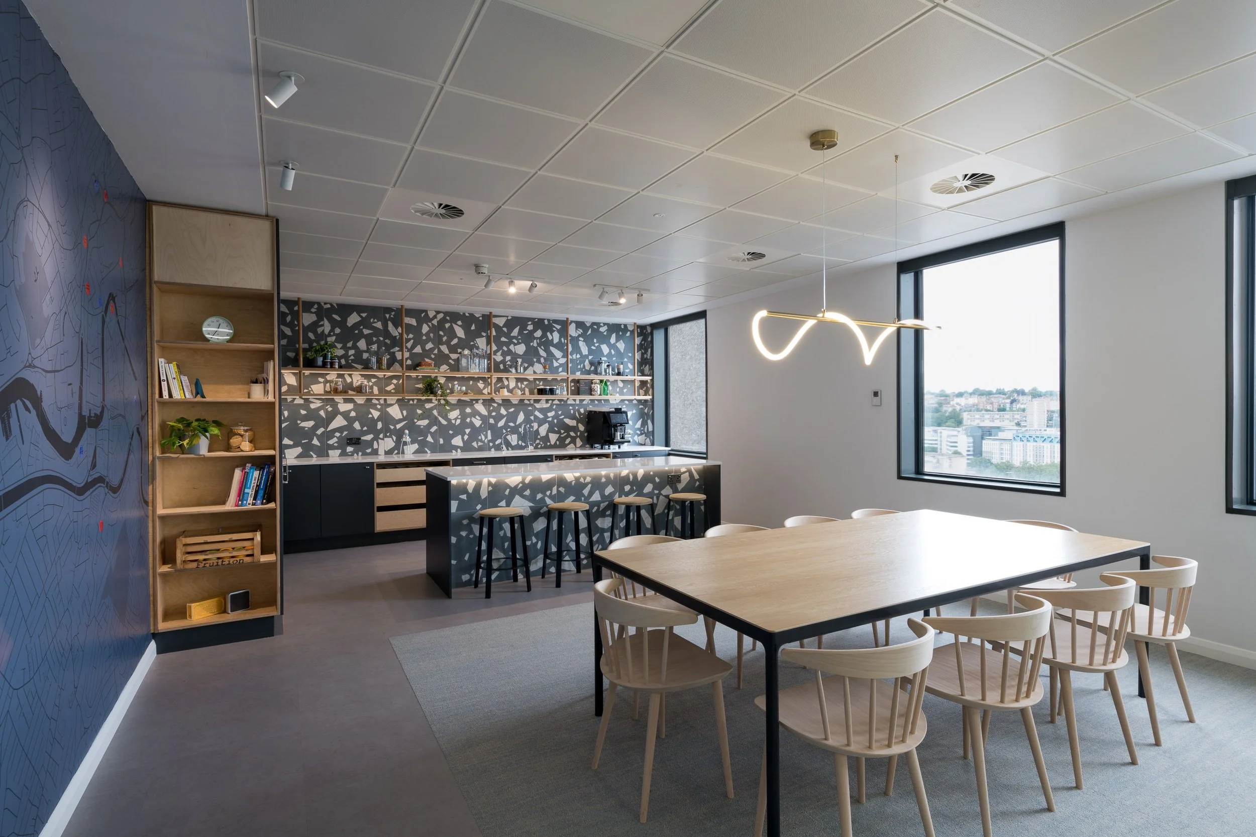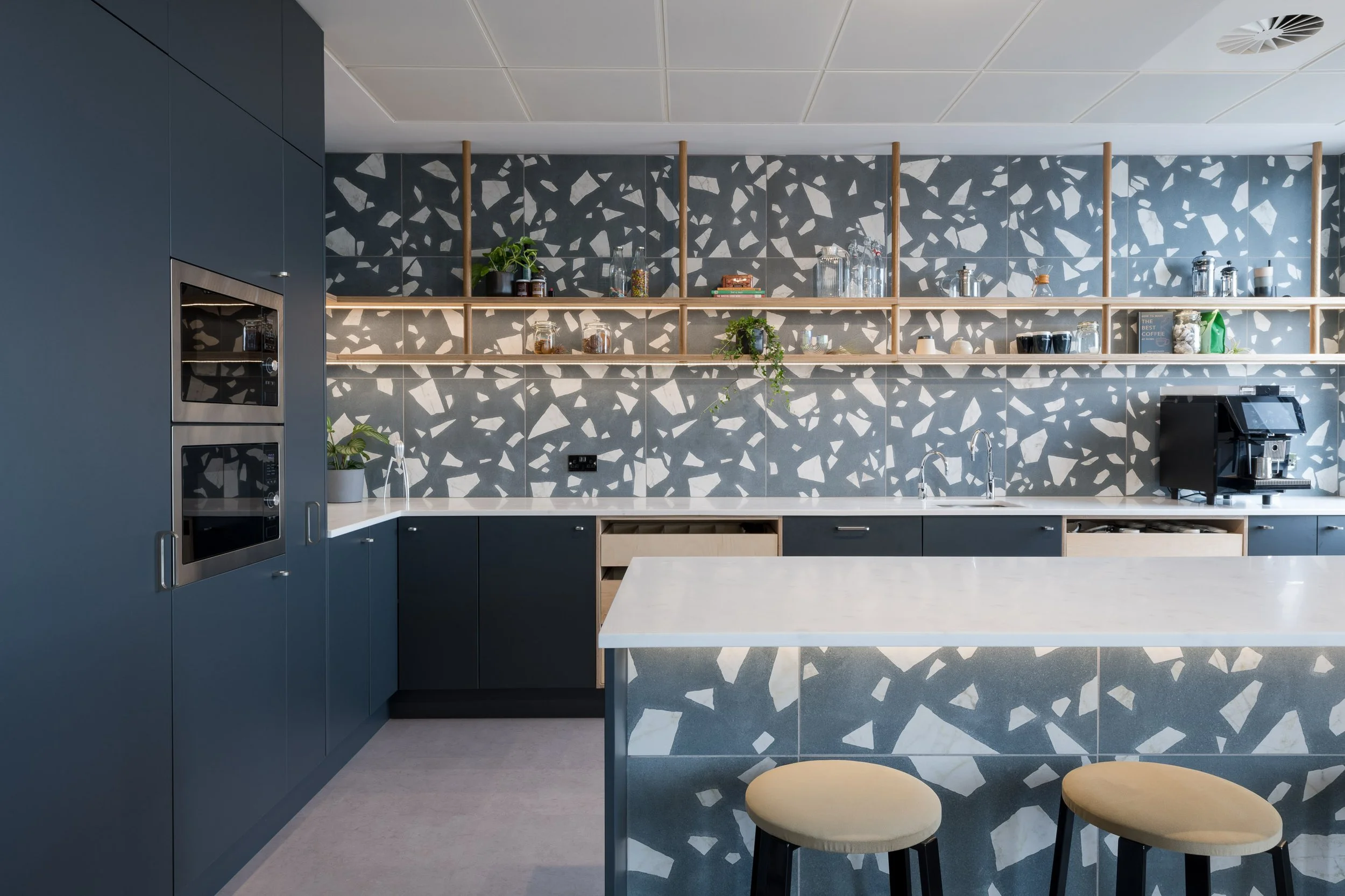 The kitchen forms the real showpiece of the workplace. Charcoal cabinets are offset with open birch ply drawers, and suspended plywood and oak shelving. Large format terrazzo tiles add a bold playful element, whilst the low level lighting complete the more moody lounge feel. All of the kitchen cabinets and joinery were made fully bespoke to make the most of the space.